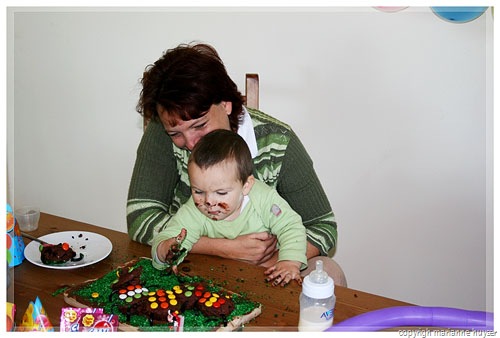 Then I came down with a n-a-s-t-y tummy bug on Thursday arvie, but hey, I was a real trooper and managed to mix and bake the cupcakes for the birthday cake, then managed to mix the carrot cake for the grown-ups and just when that was in the oven, realised I wasn't gonna make it and asked my mom to please keep an eye on it for me. That was me, in bed and I didn't move until 11:00 on Friday morning! Gids very sweetly took Kaydin with to the desert and I got to sleep in and feel marginally better. The people came at about 15:00 and we had a blast. Gids and I both got all teary-eyed when we sang "happy birthday", I tried to hide behind my camera ... The K-man didn't quite know what to do with the cake and candle at first, but later on he realised that he can actually get himself all sticky and dirty and man was that fun.
