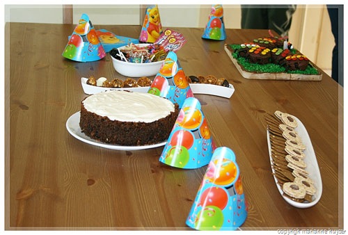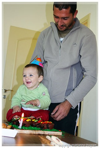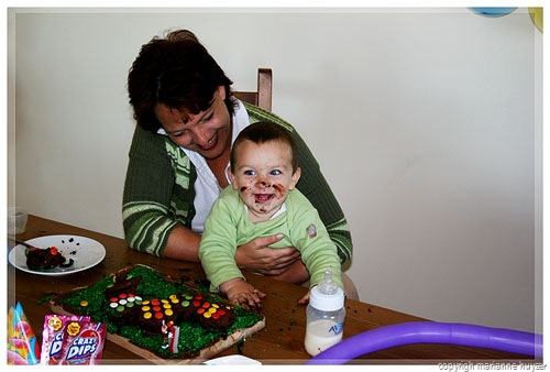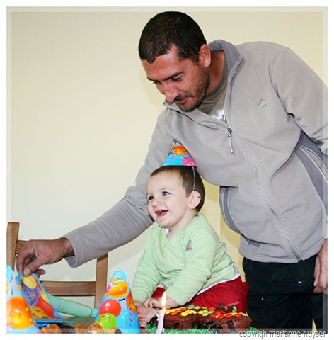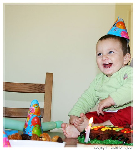Then I came down with a n-a-s-t-y tummy bug on Thursday arvie, but hey, I was a real trooper and managed to mix and bake the cupcakes for the birthday cake, then managed to mix the carrot cake for the grown-ups and just when that was in the oven, realised I wasn't gonna make it and asked my mom to please keep an eye on it for me. That was me, in bed and I didn't move until 11:00 on Friday morning! Gids very sweetly took Kaydin with to the desert and I got to sleep in and feel marginally better. The people came at about 15:00 and we had a blast. Gids and I both got all teary-eyed when we sang "happy birthday", I tried to hide behind my camera ... The K-man didn't quite know what to do with the cake and candle at first, but later on he realised that he can actually get himself all sticky and dirty and man was that fun.
